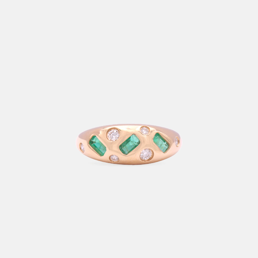 Add some dazzle to your ensemble with our Emerald and Diamond Bombé Ring! Made with 18k gold, this ring features three emerald-cut sapphires for a pop of color, and sprinkled with diamonds for a touch of sparkle. Perfect for adding a playful touch to any look.