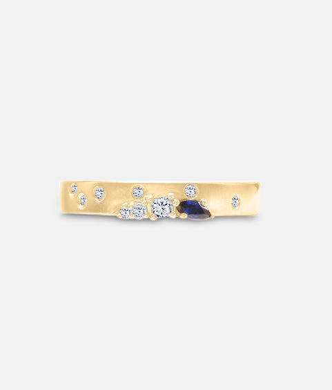 Shine bright like a starry night with this 18k gold ring featuring a sparkling sapphire and dazzling diamonds. Add a touch of celestial elegance to any outfit.