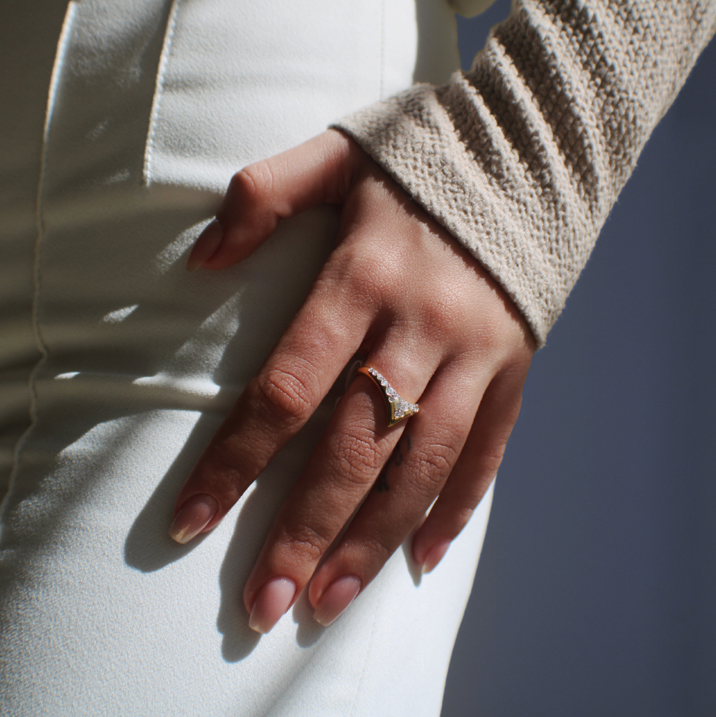 Sparkle like a star with our Starry Night Triangle Ring! This quirky 18k gold ring is encrusted with diamonds, adding a touch of elegance to any outfit. Shine bright and make a statement with this unique piece. (No need to thank us, just let the diamonds do the talking.)