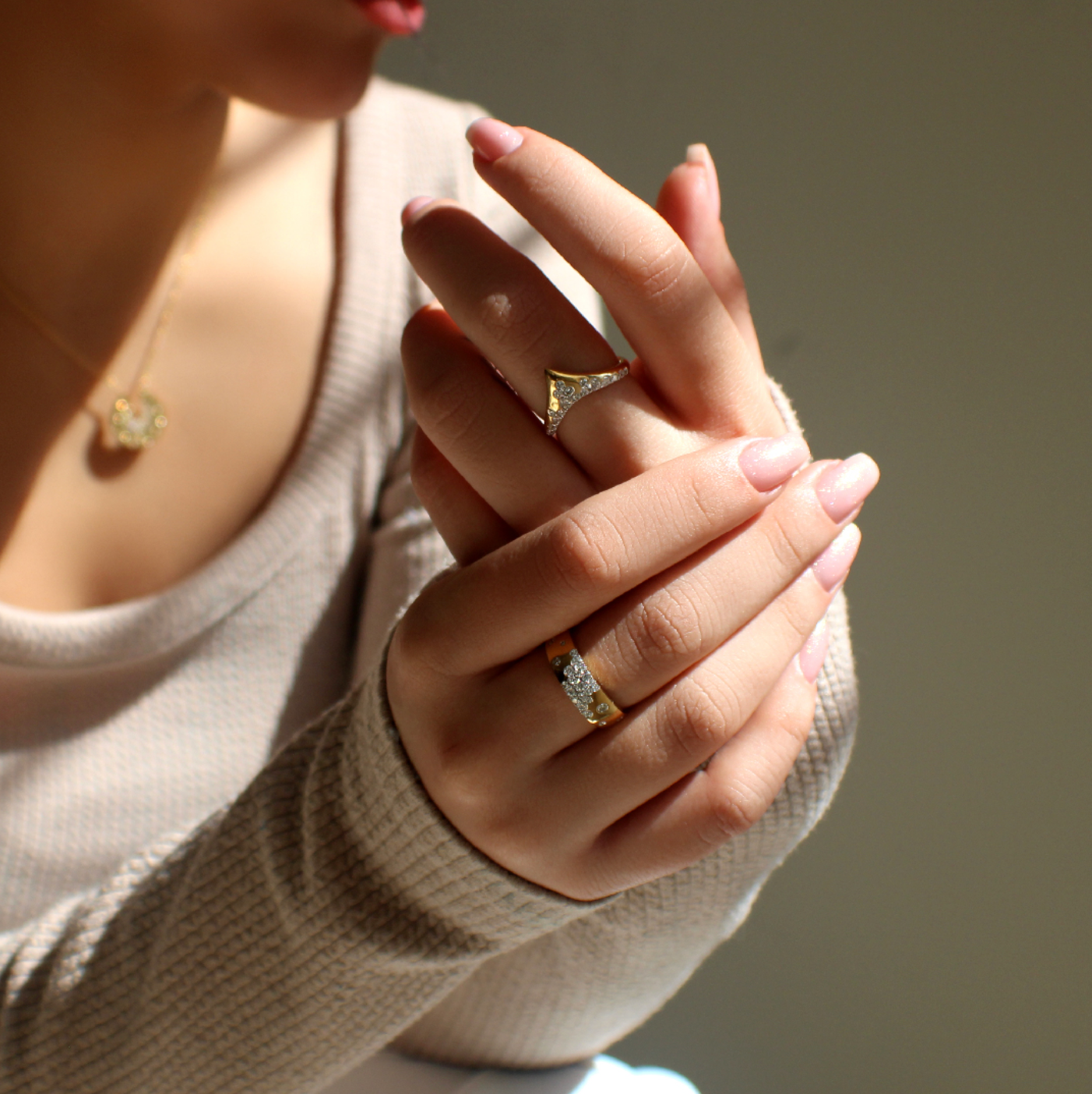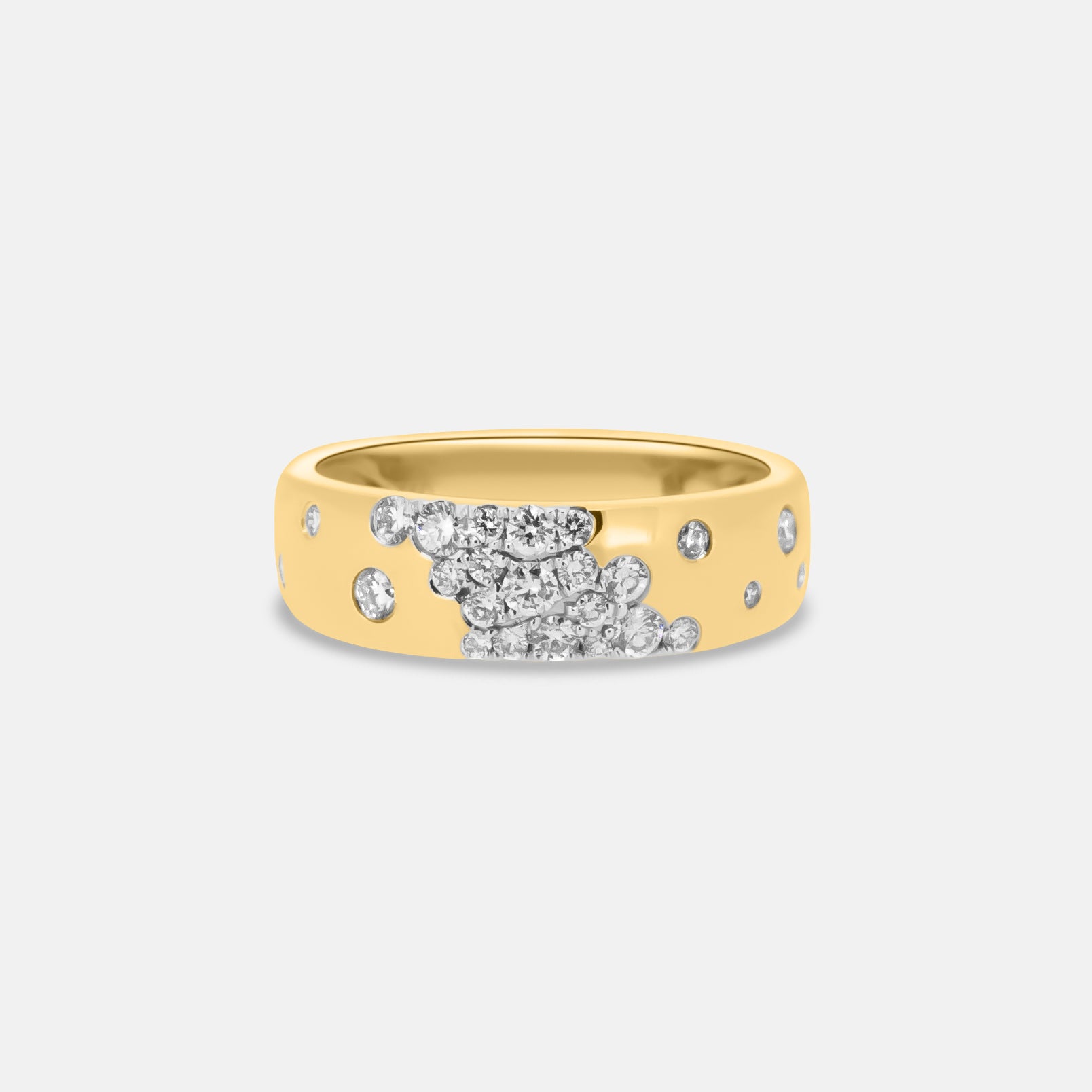 Get ready to sparkle like the night sky with our Starry Night Wide Ring! Crafted with 18k gold and encrusted with dazzling diamonds, this ring will add a touch of luxury and glamour to any outfit. Shine bright and stand out from the crowd with this unique and eye-catching ring.